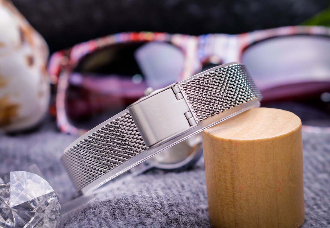 tỏa ra từ trung tâm hay các mốc giờ. Dây đeo bằng thép không gỉ thời thượng,