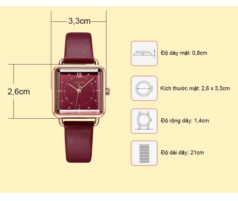JULIUS thương hiệu đăng ký đầu tiên tại Seoul Hàn Quốc, công nghệ Nhật Bản với máy Nhật nhập khẩu 100%. Thiết kế bởi chuyên gia thời trang hàng đầu Hàn Quốc, tiêu chuẩn quốc tế, lắp ráp tại Trung Quốc, bảo hành toàn quốc và quốc tế, chế độ hậu mãi tốt nhất.